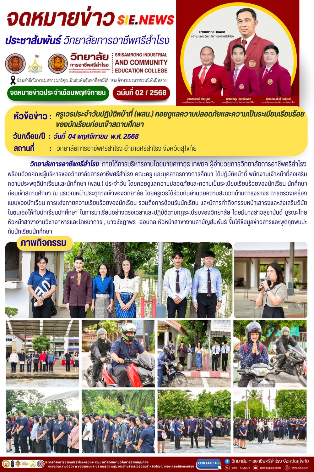 วันที่ 4 พฤศจิกายน 2568 ครูเวรประจำวันปฏิบัติหน้าที่ (พสน.) คอยดูแลความปลอดภัยและความเป็นระเบียบ
