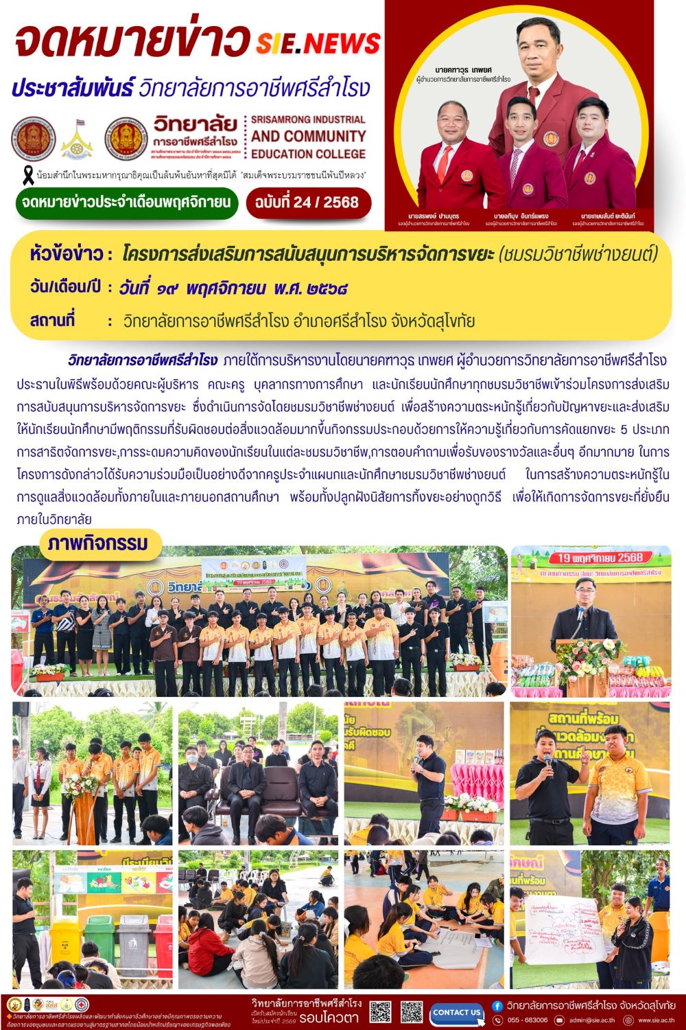 วันที่ 19 พฤศจิกายน 2568 โครงการส่งเสริมการสนับสนุนการบริหารจัดการขยะ (ชมรมวิชาชีพช่างยนต์)