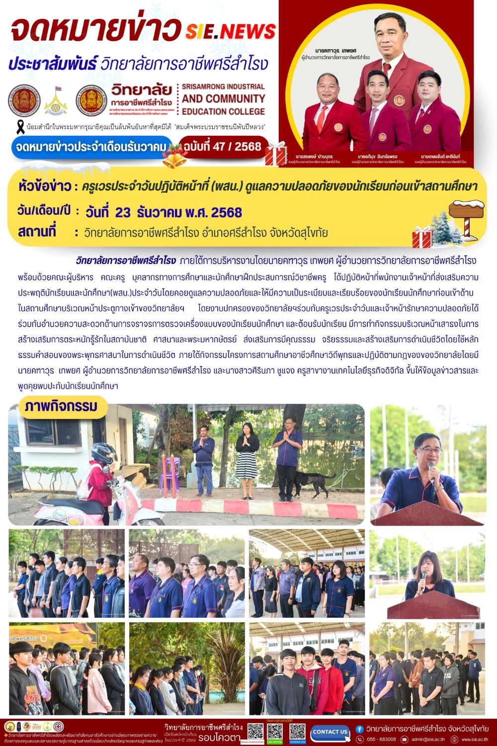 วันที่ 23 ธ.ค. 2568 ครูเวรประจำวันปฏิบัติหน้าที่ (พสน.) ดูแลความปลอดภัยของนักเรียนก่อนเข้าสถานศึกษา