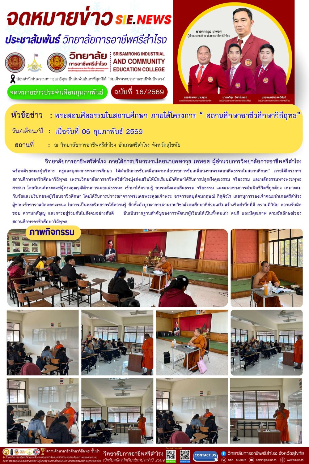 วันที่ 6 กุมภาพันธ์ 2569 พระสอนศีลธรรมในสถานศึกษา ภายใต้โครงการ “ สถานศึกษาอาชีวศึกษาวิถีถุทธ”