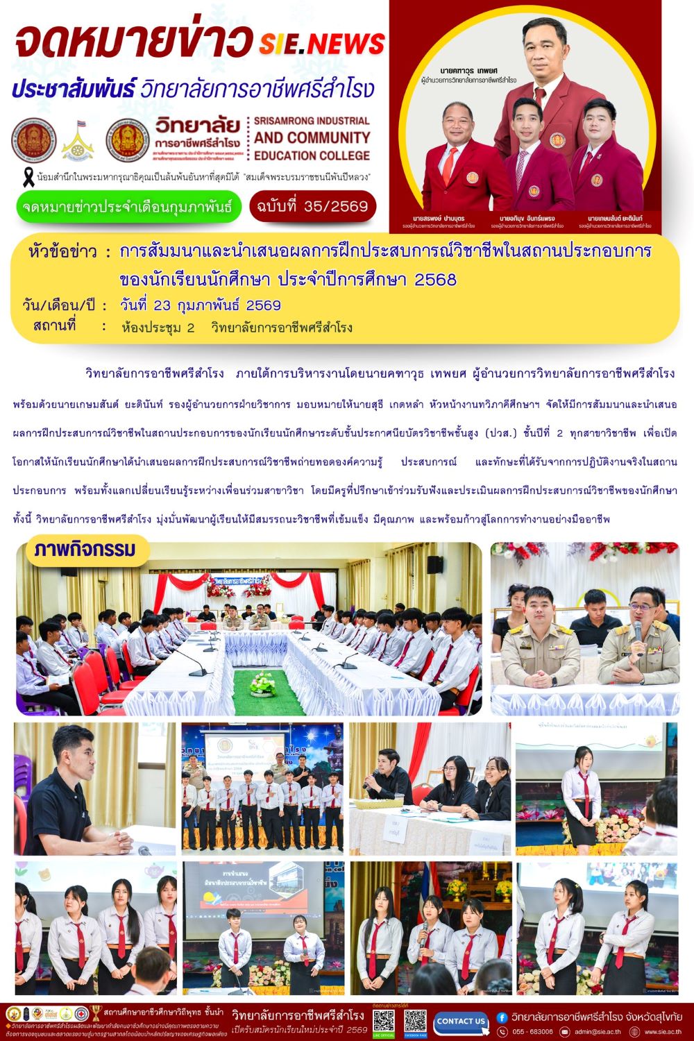วันที่ 23 กุมภาพันธ์ 2569 การสัมมนาและนำเสนอผลการฝึกประสบการณ์วิชาชีพ ประจำปีการศึกษา 2568