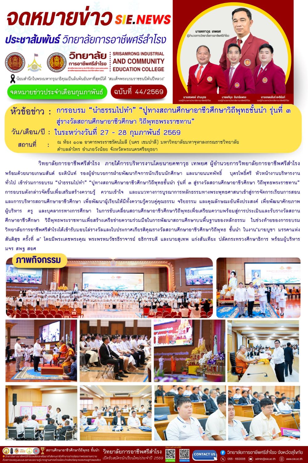 วันที่ 27-28 กุมภาพันธ์ 2569 การอบรม “นำธรรมไปทำ” “ปูทางสถานศึกษาอาชีวศึกษาวิถีพุทธชั้นนำ รุ่นที่ 3