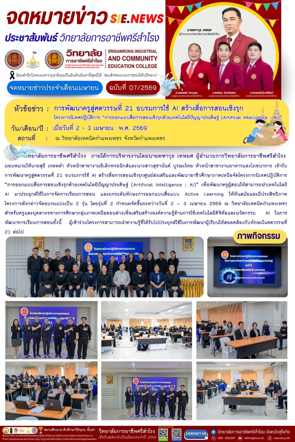 วันที่ 2 - 3 เมษายน พ.ศ. 2569 การพัฒนาครูสู่ศตวรรษที่ 21 อบรมการใช้ AI สร้างสื่อการสอนเชิงรุก