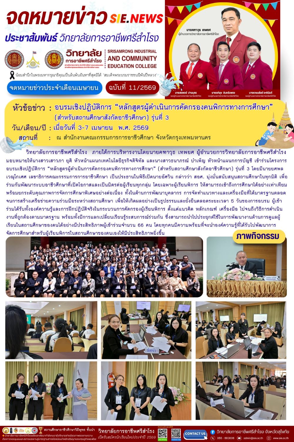 วันที่ 3-7 เมษายน พ.ศ. 2569 อบรมเชิงปฏิบัติการ “หลักสูตรผู้ดำเนินการคัดกรองคนพิการทางการศึกษา”