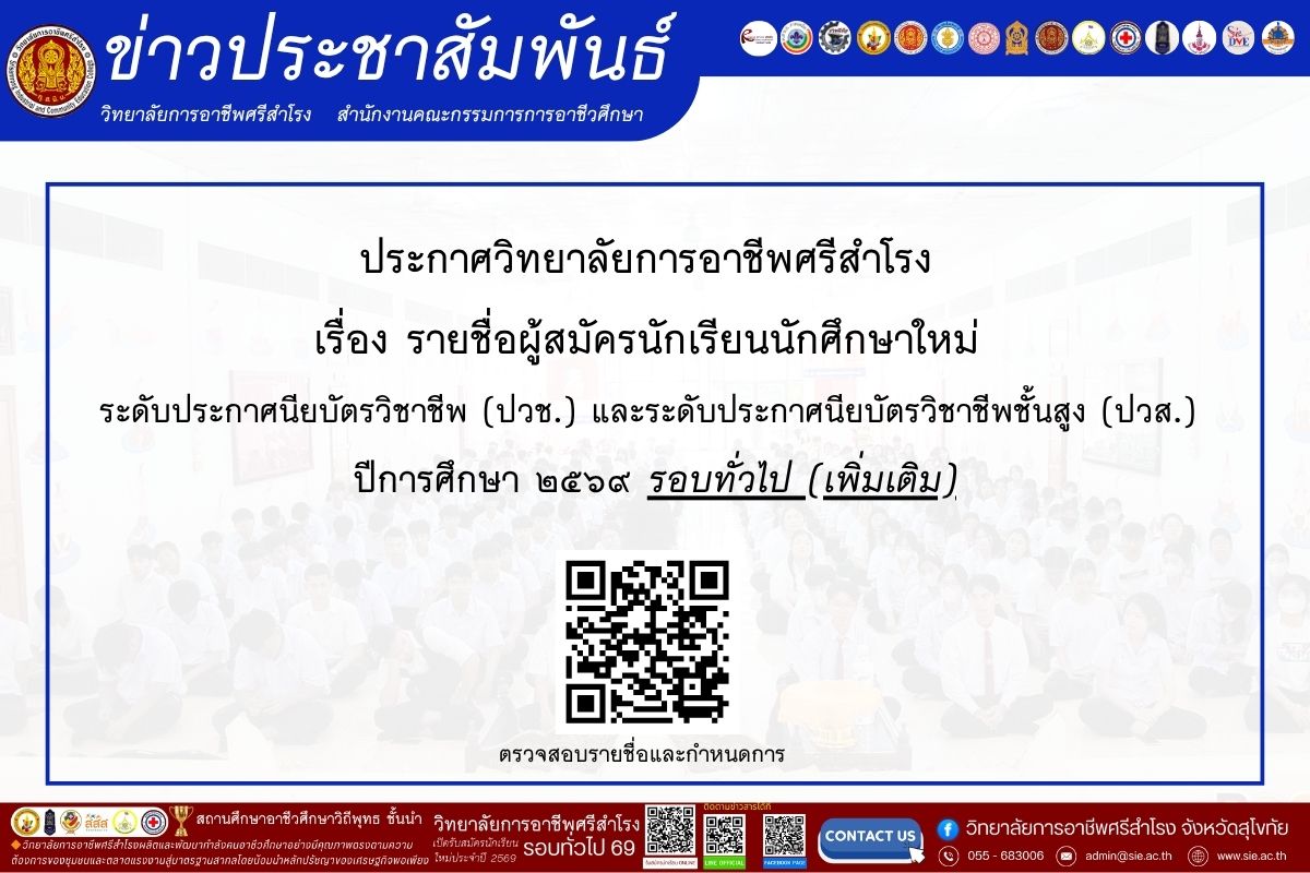 ประกาศวิทยาลัยการอาชีพศรีสำโรง เรื่อง รายชื่อผู้สมัครนักเรียนนักศึกษาใหม่ ระดับประกาศนียบัตรวิชาชีพ