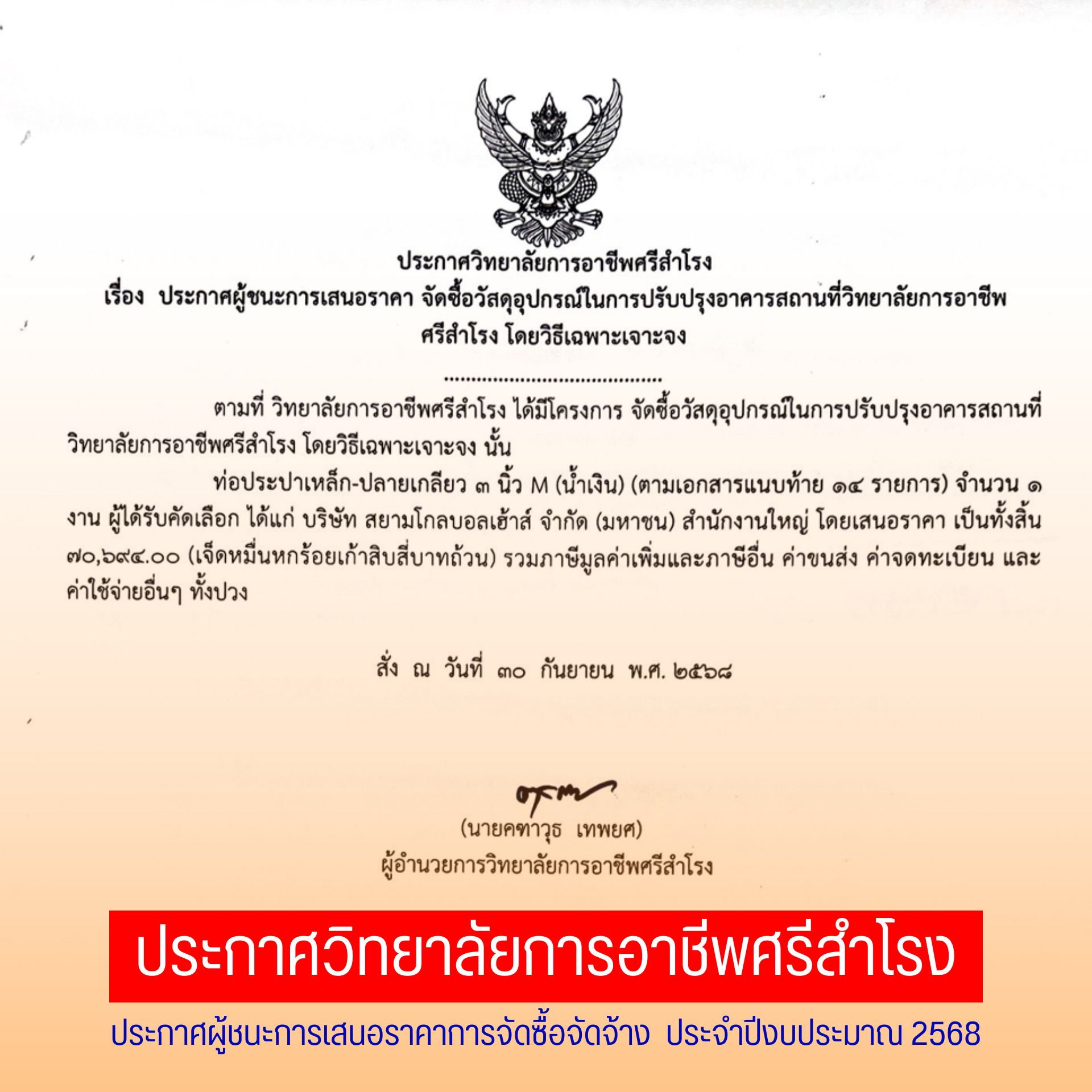 ประกาศวิทยาลัยการอาชีพศรีสำโรง ประกาศผู้ชนะการเสนอราคาการจัดซื้อจัดจ้าง ประจำปีงบประมาณ 2568