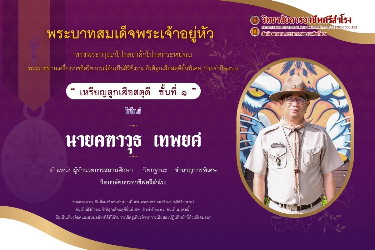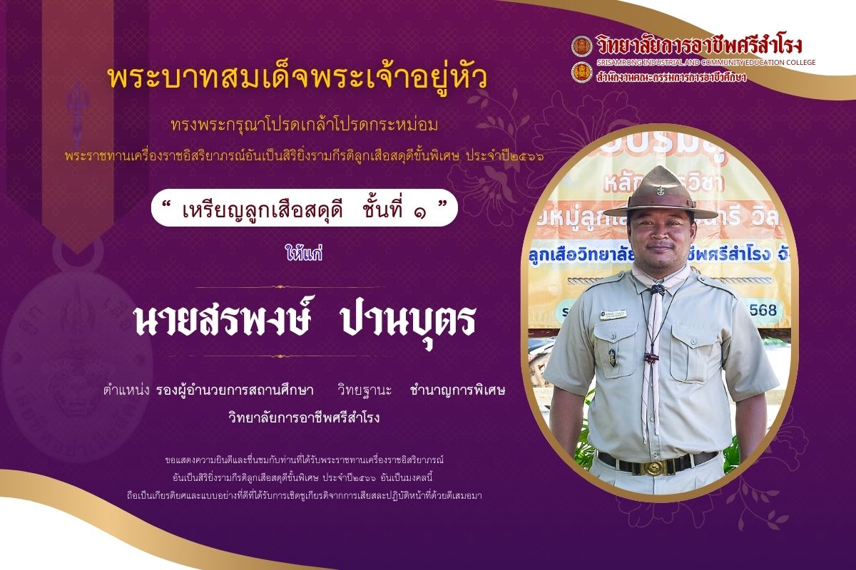 พระบาทสมเด็จพระเจ้าอยู่หัว ทรงพระกรุณาโปรดเกล้าโปรดกระหม่อม พระราชทานเครื่องราชอิสริยาภรณ์อันเป็นสิริยิ่งรามกีรติลูกเสือสดุดีขั้นพิเศษ ประจำปี๒๕๖๖ “ เหรียญลูกเสือสดุดี ชั้นที่ ๑ ” |